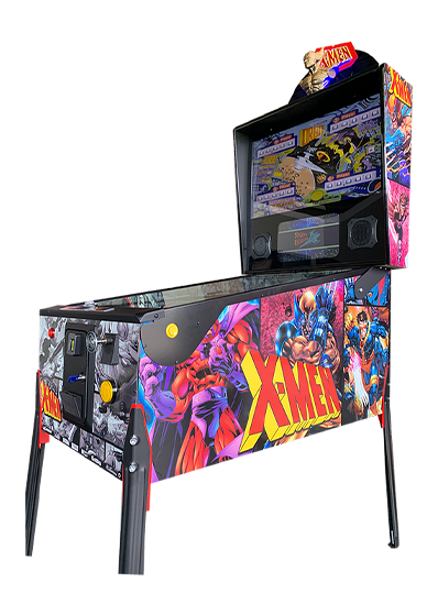 • Close-up of a pinball machine playfield with retro design and "Extra Ball" text.